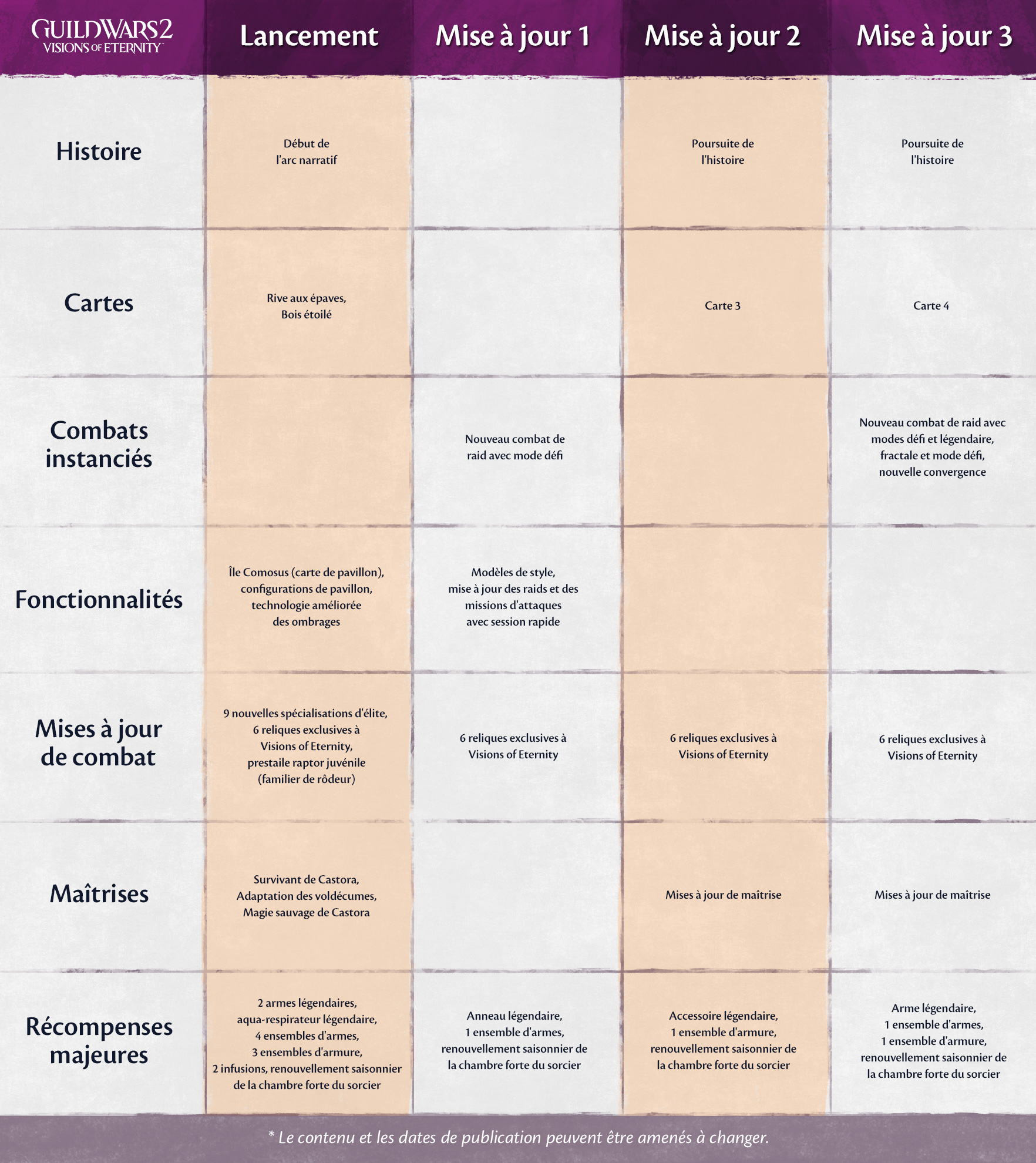 Préparez-vous à embarquer pour un nouveau périple en Tyrie : Guild Wars 2®: Visions of Eternity™ va paraître vers 17h, heure de Paris (9h, heure du Pacifique) ! Explorez une nouvelle terre, forgez de nouveaux équipements et armes légendaires, et maîtrisez de nouvelles capacités lors de votre traque de l’Enqueste pour déjouer les dernières manigances de ses membres.